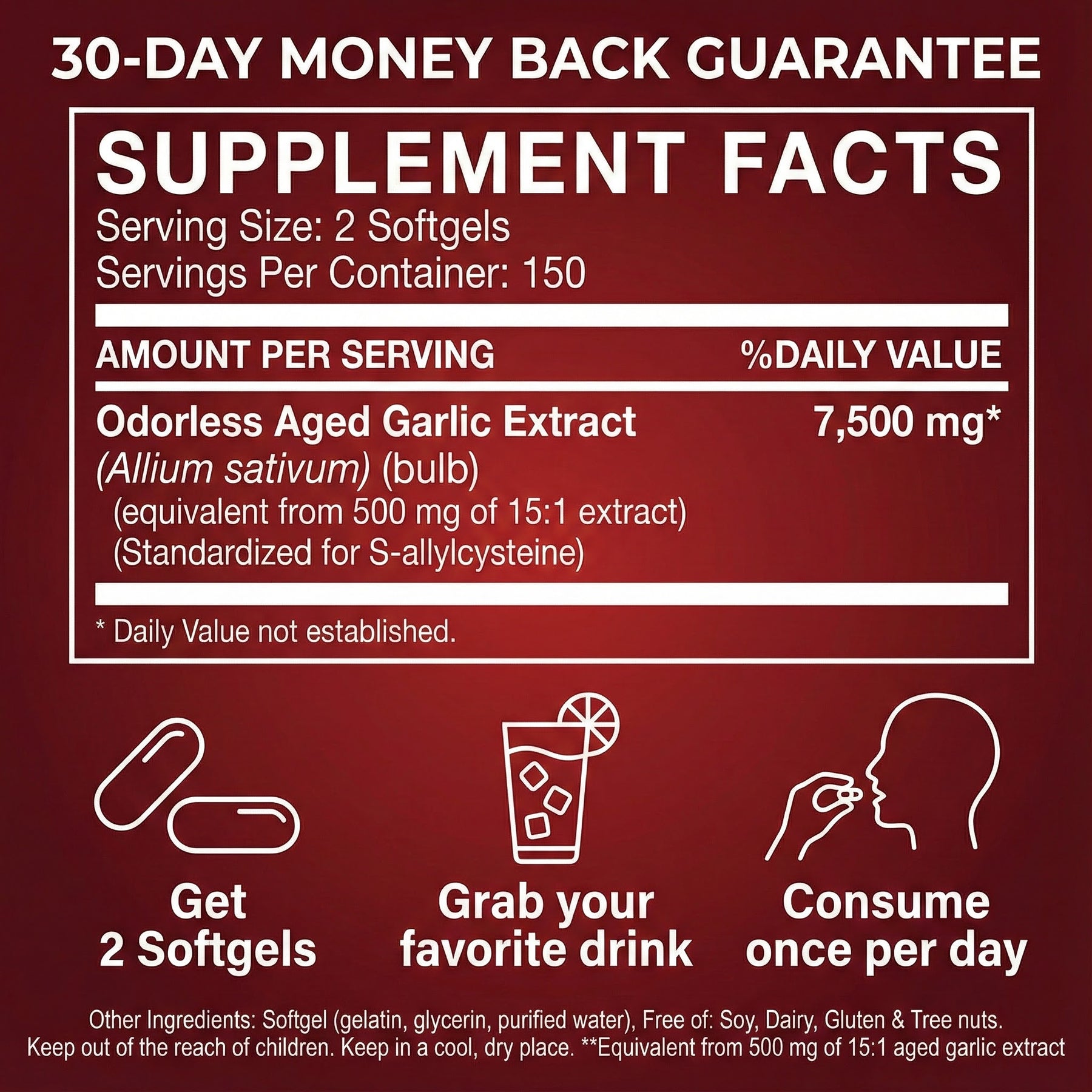 Our premium aged garlic extract is fermented for over 24 months using organically grown bulbs, enhancing bioavailability while eliminating harsh odor and stomach discomfort. Each serving delivers a 7,500mg equivalent dose of bioactive compounds that support cardiovascular health, healthy cholesterol levels, and immune function—all in an easy-to-digest softgel you can take without the telltale garlic breath.