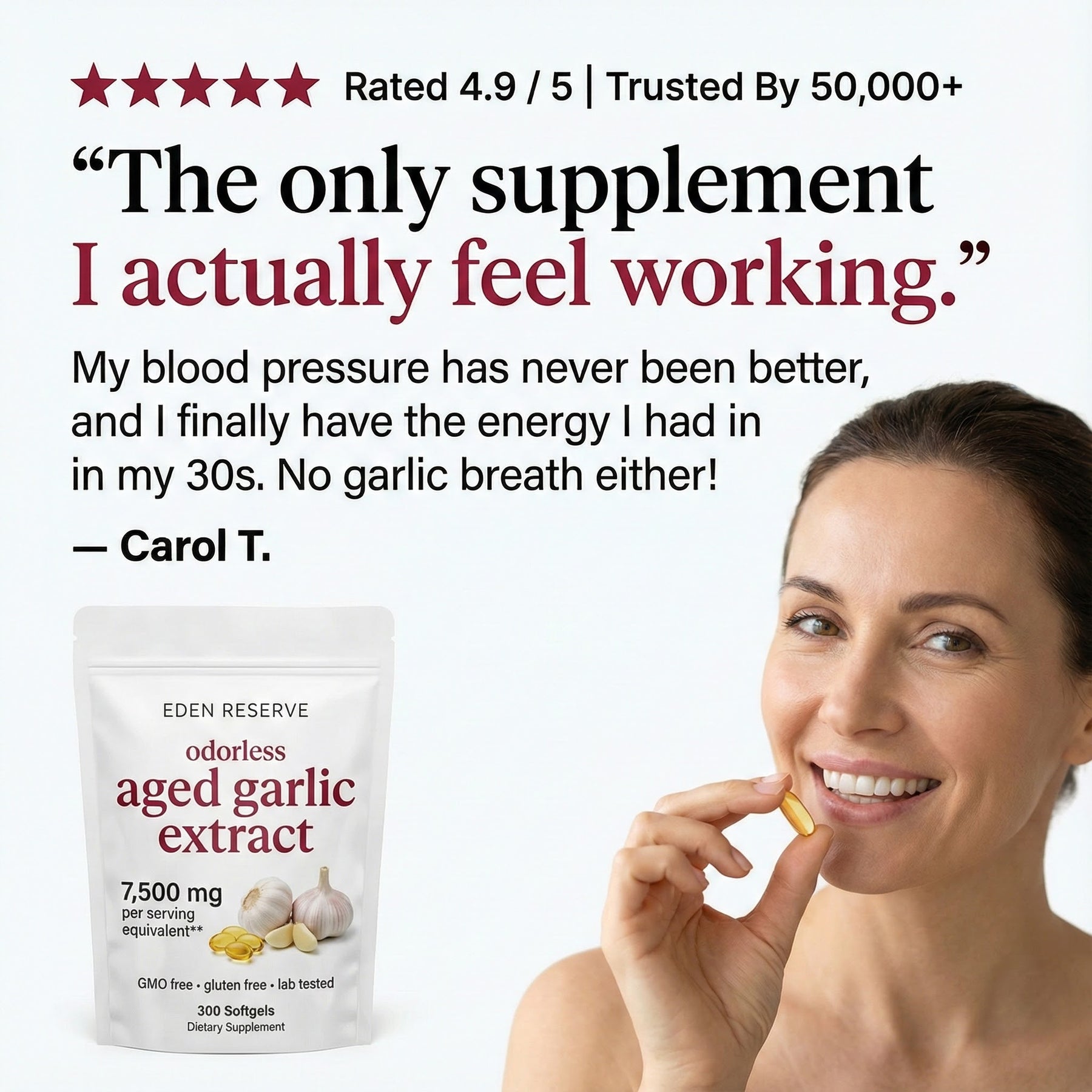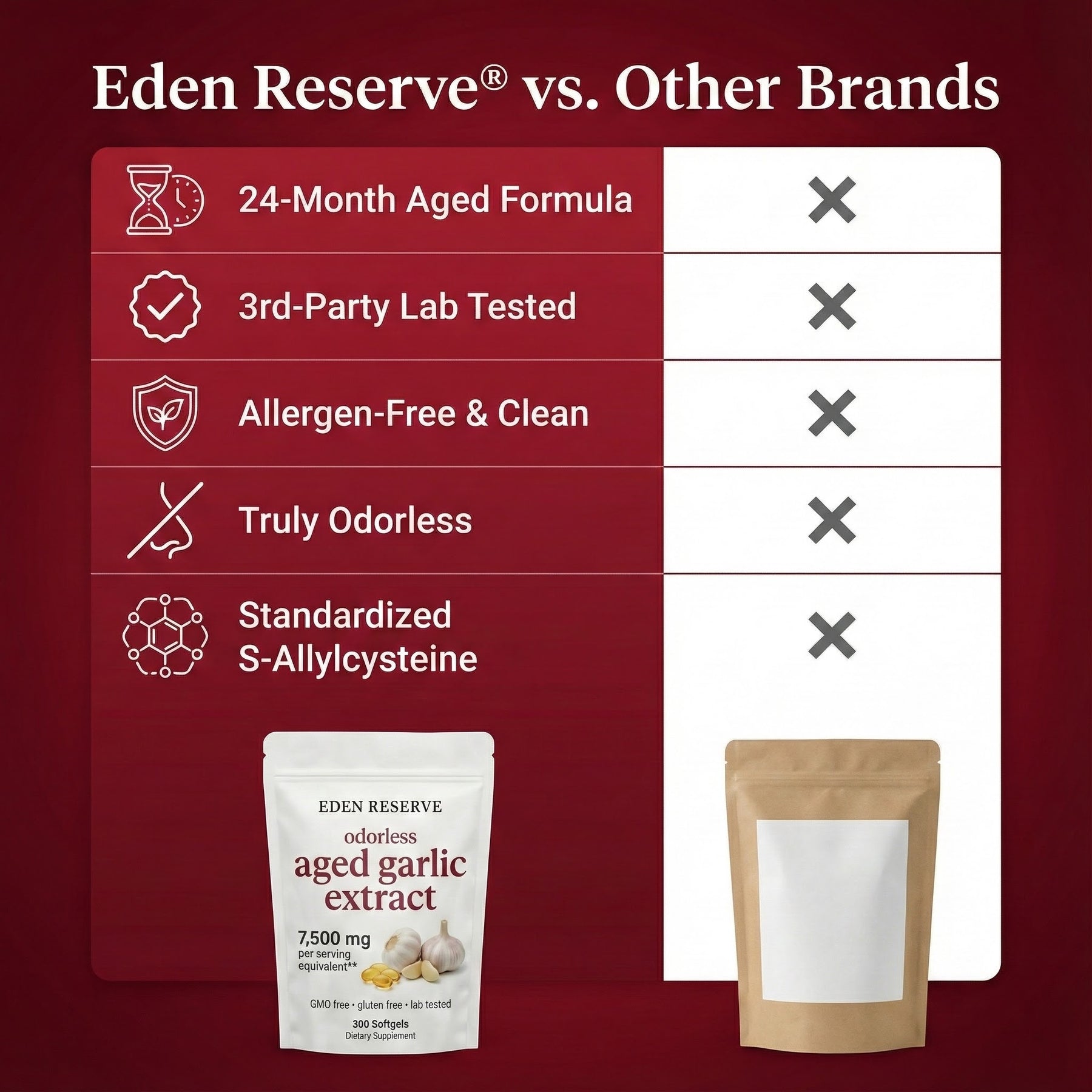 Eden Reserve Aged Garlic Extract has been formulated to support healthy blood pressure levels already within normal range. The active compound S-allylcysteine, created during our 24-month aging process, has been extensively studied for its cardiovascular benefits. Clinical research suggests that aged garlic extract may help: